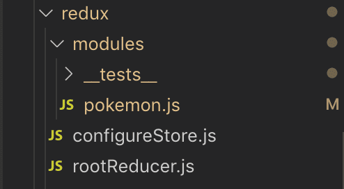 The rootReducer is a file that contains all the reducers used across the app, the configureStore.js file is for setting up the store, it contains the rootReducer and it could also have all the extra middleware, we might want to add. The modules folder contain al the duck modules, we wish(we’re going to talk of them later) and the tests for each of them.